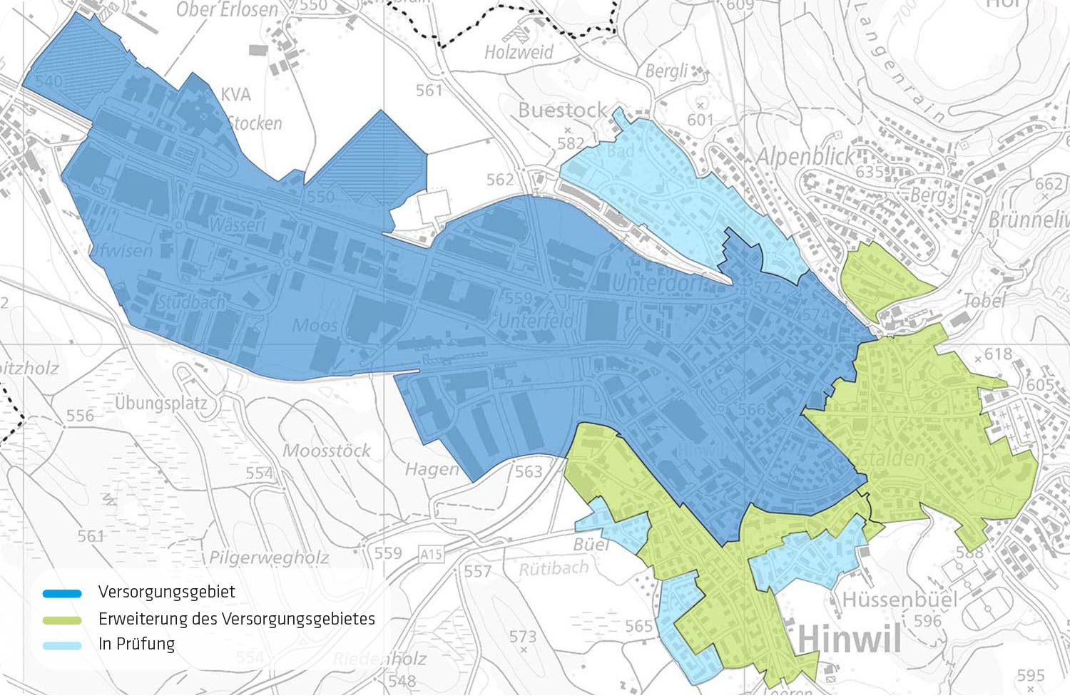 In den letzten Jahren haben wir unser Versorgungsgebiet laufend ausgebaut und verdichtet. Es umfasst heute rund 350 Kilometer Transport- und Verteilleitungen sowie Zuleitungen zu Liegenschaften.